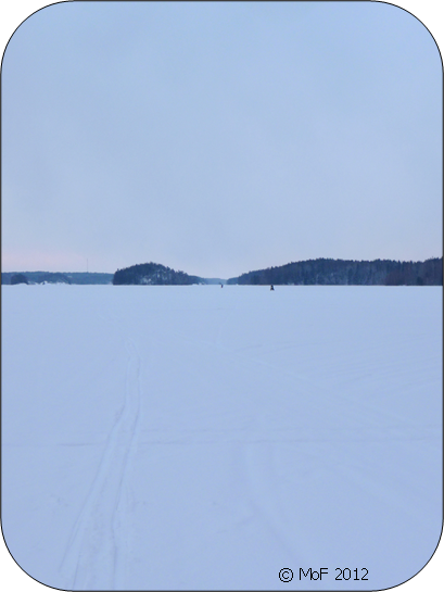 Nu blev det dö’trist. Det kändes som om jag befann mig i en vit öken. Långt borta till vänster såg jag Ängsuddens ladugård och långt borta till höger syntes Labbnäs. Målet mitt fram verkade minst sagt avlägset, men det var bara att staka på. Nu hade jag ju avverkat två tredjedelar av sträckan.