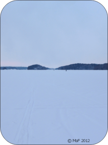 När jag hade avbildat trion insåg jag att det gällde att fatta ett oåterkalleligt beslut. Jag var knappt halvvägs… Skulle jag fortsätta (orka) ända fram till kyrkstranden eller vända om? Jag beslöt fortsätta och tröstade mig med att jag alltid kunde ta en taxi hem om jag mot förmodan inte orkade skida tillbaka. 😉