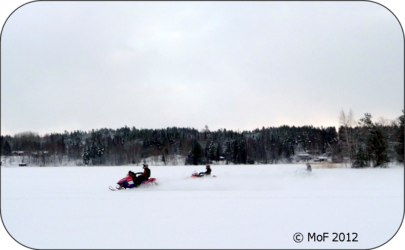 Det blev en paus till innan jag var framme vid Östergårds. Jag hörde isen rämna med jämna mellan­rum, i övrigt var det ljuvligt tyst och stilla. Men säg den lycka som varar för evigt. Vid Långholmens norra udde hörde jag ett välbekant motorljud närma sig bakifrån. Ögonblicket senare susade tre snöskotrar förbi och lämnade efter sig ett moln av avgaser. Varför har man inte samma krav på av­gas­rening på dom som på bilar?