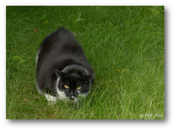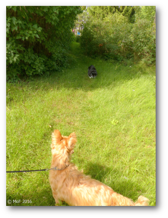 Hon väste och morrade hela vägen med klorna i min arm medan hon stint bevakade hunden som kom bakom oss, men fann sig i att bli buren. Vi stannade vid trappan så avståndet till hunden ökade snabbt i och med att sommargrannen gick vidare. Därmed var hotet avvärjt och friden återställd. 🙂