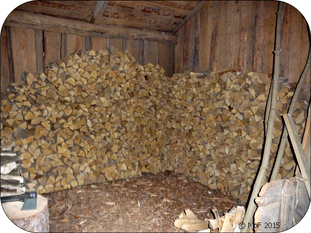 Efter fem timmars arbete syntes det knappt att vedhögen hade minskat. Dessutom hotade MI med snöfall under natten så jag drog min andra presenning över högen för säkerhets skull.