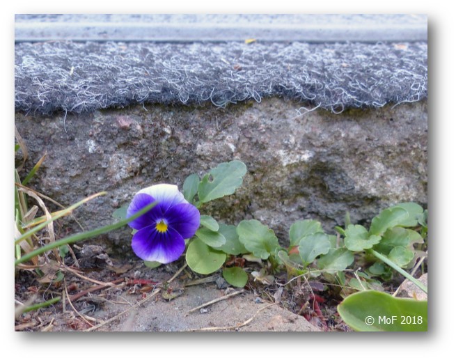 Mellan trappan och trappstenarna finns en smal remsa jord. Just där har den här lilla kämpen bestämt sig för att växa och slå ut i blom. 🙂